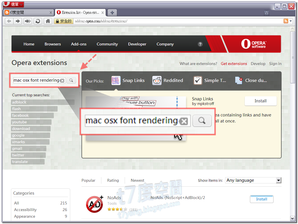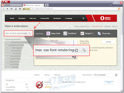 2. 進入Opera延伸套件網頁後,輸入「Mac OSX Font Rendering」後點選搜尋按鈕。