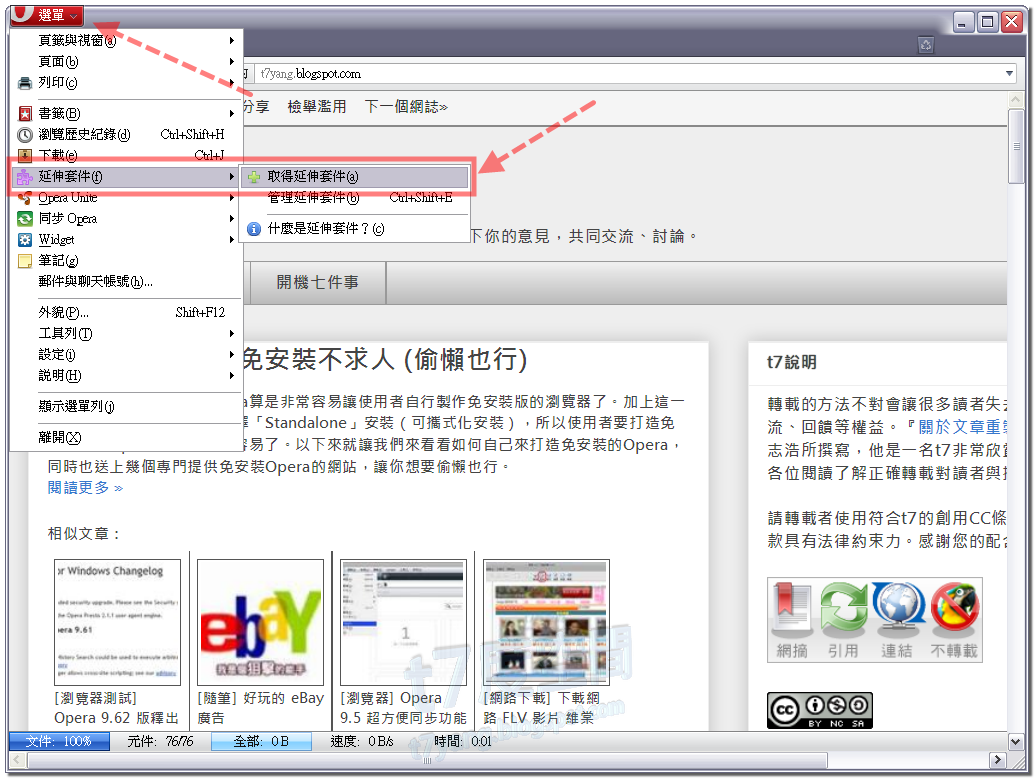先開啟[O 選單],點選[延伸套件]子選單的[取得延伸套件]項目