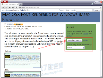 由於Opera 11有很多創新性的功能,對於一些使用者來說可能還需要一段時間適應或觀望。但是這樣就無法使用這個強化顯示效果的功能也太可惜了。但是別擔心,這個延伸套件的原理是使用JavaScript的方式來達到渲染效果的。所以如果你現階段真的不想更新到Opera 11,但又很喜歡這樣的渲染效果的話,你可以考慮自行套用JS檔案到你目前的Opera中。輸入[http://userstyles.org/styles/31924]網址進入提供文字渲染效果的JavaScript網站。選擇你的瀏覽器並點選[Install as User JS]按鈕。