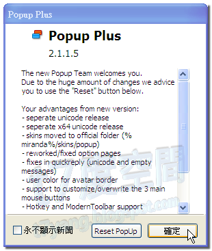 除了聯絡人的狀態外,我們還需要其他的事件通知功能。譬如說朋友丟檔案給你,或是有人加你的訊息。這些重要的事件也需要有通知的功能才行,PopUp Plus就是用來填補這塊空缺的外掛。