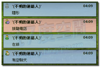 這個元件的中文可以簡單翻譯為「狀態變更通知」。顧名思義,它的功能就是在你的聯絡人狀態有所變更時顯示通知訊息。好比說你的聯絡人上線了、離線了、甚至是隱形了(顯示為離線),這個外掛都會顯示通知訊息(當然有詳細的選項可以設定)。比起WLM單純的上線和離線的通知,這個外掛的功能更強大了。
