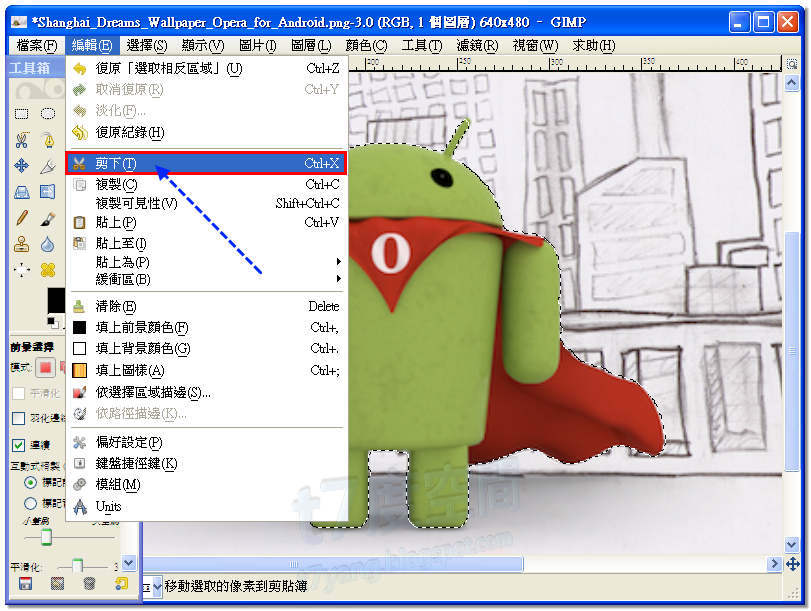- 反轉選取範圍後,用〔剪下〕的功能把不要的背景區域剪掉。