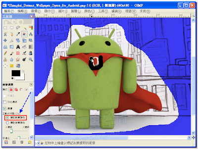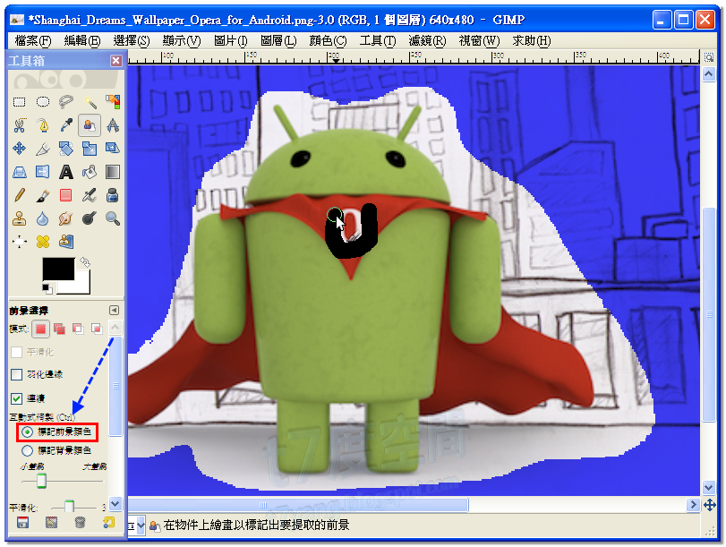 - 確保目前的選項是〔標記前景顏色〕,然後在目標區域中用游標標記前景顏色。標記後程式會自動切割目標的範圍,標記的時候儘量把目標區域的顏色都涵蓋到。你可以多次標記,程式會自動調整選取的範圍。